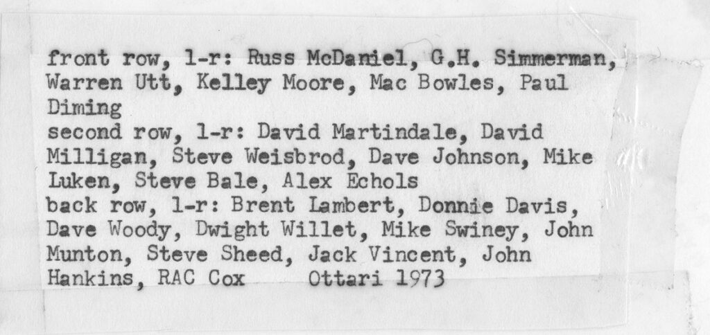 Back Row: Brent Lambert, Donnie Davis, Dave Woody, Dwight Willet, Mike Swiney, John Munton, Steve Shedd, Jack Vincent, John Hankins, RAC Cox